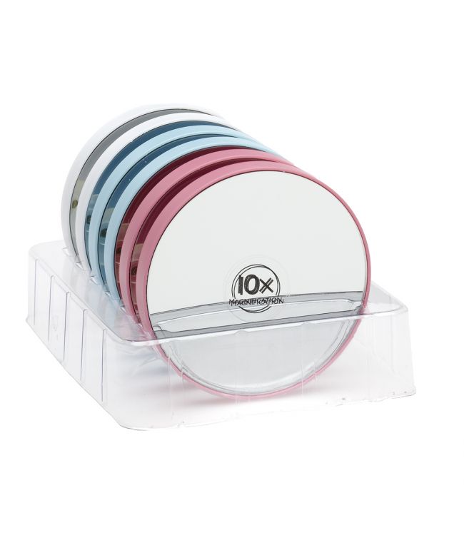 Badkamerspiegel met Zuignap 10x vergrotend is een wandspiegel met een zuignap. Deze spiegel heeft één zijde die 10x vergroot en een zijde met zuignappen. Deze spiegel heeft een diameter van 8.5cm. In een display zitten 6 spiegels met 3 verschillende kleuren: Roze, blauw en wit.