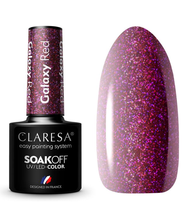 Claresa UV/LED Gellak 5ml Galaxy Red is een gel nagellak in een donkerrode kleur met galactisch sprankelende finish uit de Galaxy collectie van Claresa. Reik naar de sterren en ga mee op intergalactische reis door het heelal met de Galaxy collectie! De collectie bestaat uit kleuren met unieke, driedimensionale glitters die net zo stralen als de sterren. Droom weg bij de fonkelende glitters. Galaxy Red is een diep rode kleur met een explosie aan glitters in zilveren, rode en roze/paarse kleuren. De kleur doet denken aan het diep, intens rood licht dat overgaat in roze. De rode nagellak met glanzende deeltjes geeft de nagels een uniek karakter. Perfect om op zichzelf te gebruiken of om nail-art creaties van unieke details te voorzien.
