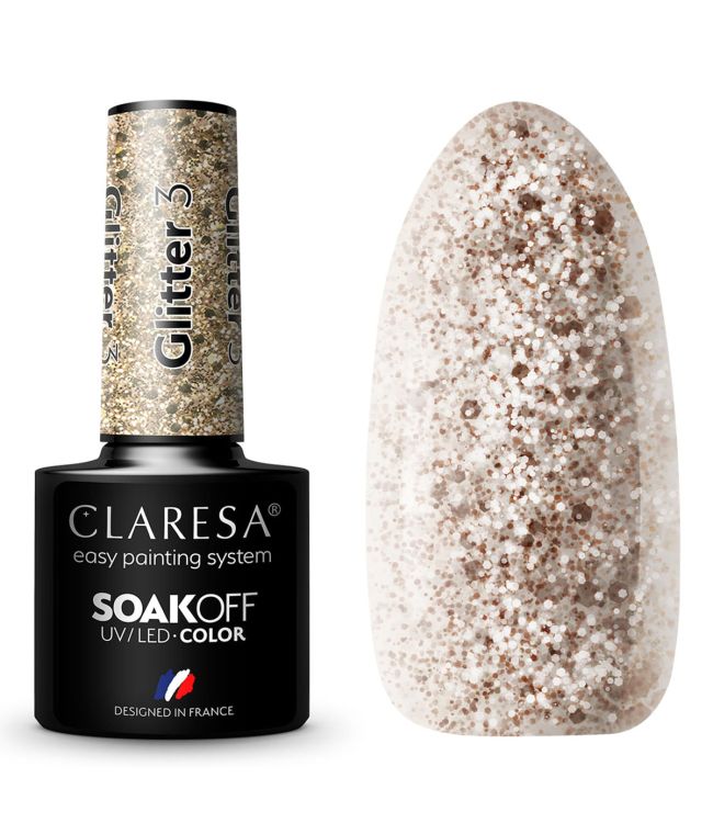 Claresa UV/LED Gellak 5ml Glitter 3 is een gel nagellak in een transparante kleur met een explosie aan goud glinsterende glitters uit de Glitter collectie van Claresa. Maak van elke dag een feestje met prachtige glitter op de nagels die niemand kan weerstaan. De Glitter collectie is ontworpen om op te vallen. De lak is transparant met losse glitter deeltjes. Perfect om op te bouwen tot een sterkere dekking of om over andere kleuren aan te brengen voor een statement! Met de Glitter collectie maak je van elke nail-art design een eyecatching look. Glitter 3 is een glamour lak met prachtige, glinsterende goudvlokken die de look naar een hoger niveau tillen.
