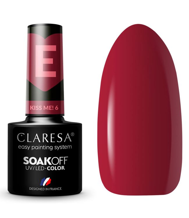 Claresa UV/LED Gellak 5ml Kiss Me 6 is een gel nagellak in donkerrode kleur uit de Kiss Me collectie van Claresa. De Kiss Me collectie bestaat uit warme roze, rode en bordeaux tinten die chique en elegant ogen. Meer Lezen