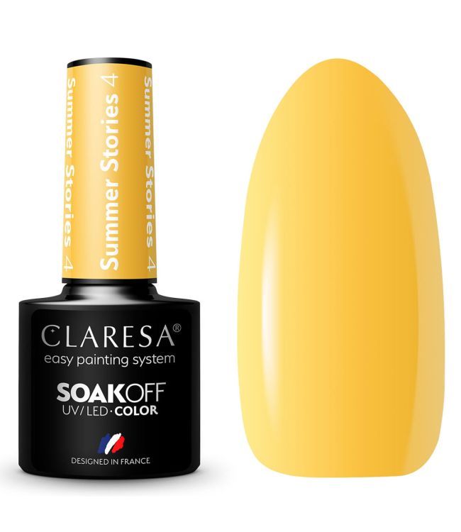 Claresa UV/LED Gellak 5ml Summer Stories 4 is een gel nagellak in een sappige, mango gele kleur uit de Summer Stories collectie van Claresa. De Summer Stories collectie neemt je mee op vakantie naar diverse bestemmingen in de verste uithoeken van de wereld. De collectie bevat felle en intense zomerkleuren die energiek en dynamisch zijn. Ga voor een manicure in de kleuren van de regenboog met Claresa Summer Stories. Summer Stories 4 is een kleur geïnspireerd op de weelde aan kleuren, geuren en exotische kruiden tijdens een vakantie in India. De zomerse, gele kleur is net zo sappig als de rijpste mango, energiek als de zon en prachtig als Indiase kleding. Deze kleur is mooi op zichzelf, maar ook prachtig in combinatie met andere kleuren voor nail-art. Speel deze zomer met kleuren en ga voor gedurfde combinaties met de gele kleur van Summer Stories 4.