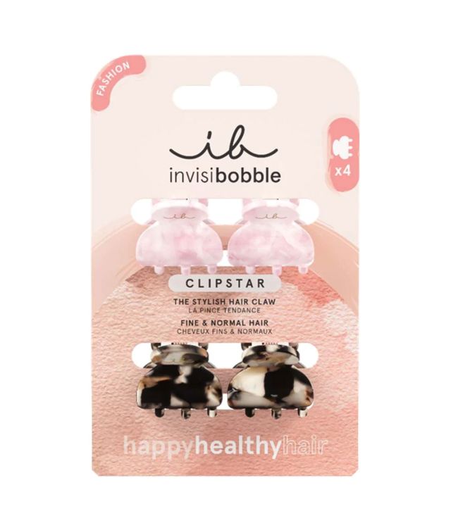 Invisibobble Clipstar Petit Four 4st. is een set van 4 super leuke haarclips. Dit haaraccessoire is geschikt voor veelzijdige kapsels en houdt zelfs de kleinste haarlokjes op hun plek. De hoogwaardige claw clips hebben een trendy design en een kleurcombinatie van neutrale tinten en lila. De klemmen zijn van hoogwaardige kwaliteit en grijpen goed vast in het haar, zodat je coupe de hele dag goed blijft zitten. De klemmen zijn écht stevig en door het kleine formaat vooral geschikt voor fijn tot normaal haar. Echter werken de clips ook goed op smallere plukjes dik, krullend of weerbarstig haar.
