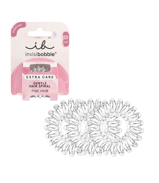 Invisibobble Extra Care Gentle Crystal Clear 3 Stuks is een extra verzorgende variant van de normale Invisiboble en hierom geschikt voor fijn haar. Invisibobble is hét nieuwe elastiek. De Extra Care Gentle Hair Spiral biedt maximale fixatie én is zacht voor het haar. Door dit speciaal ontworpen model vormen er geen knikken, bobbels en/of striemen in het haar na het dragen van bijvoorbeeld een staart. De uiteinden van dit elastiek bestaan namelijk niet uit ijzer, zoals bij ‘normale’ elastieken. Hierdoor is de Invisibobble niet schadelijk voor het haar.
