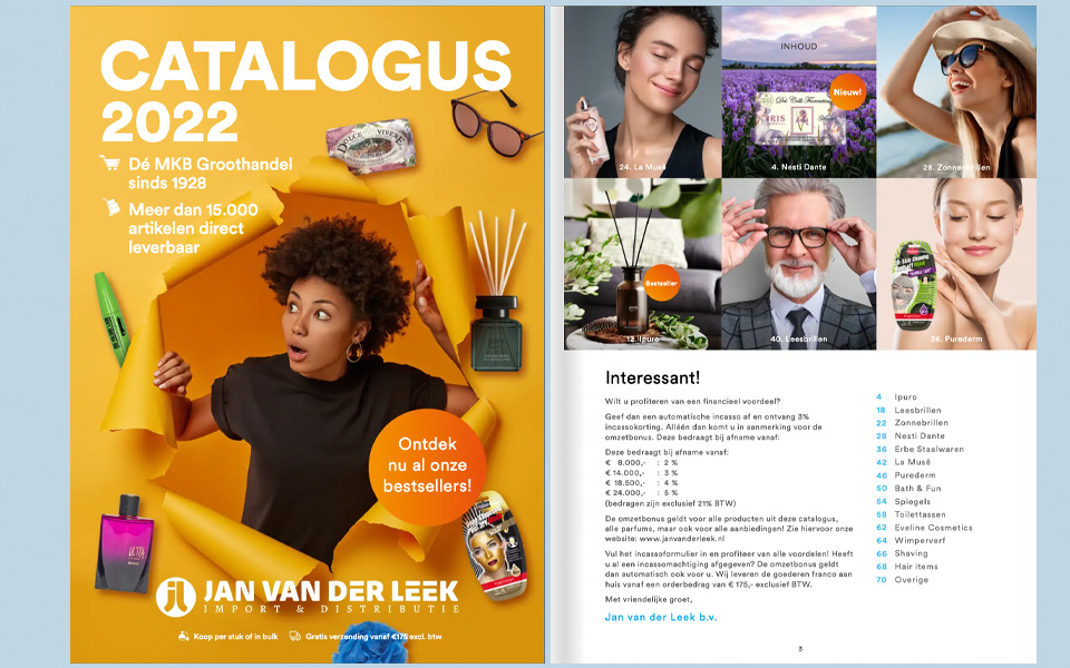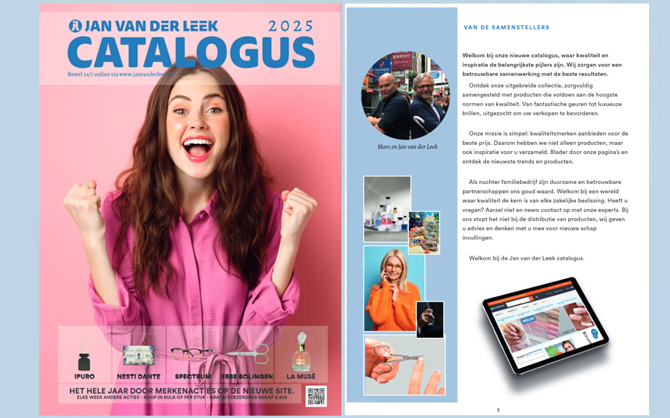 Het gehele assortiment van Jan van der Leek wordt gepresenteerd in de uitgebreide catalogus. Bent u benieuwd, schrijft u zich dan nu in voor deze catalogus!
