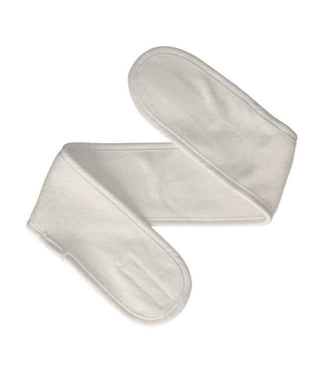 Make Up Band Wit Klittenband Sluiting is een haarband die gebruikt kan worden om het haar uit het gezicht te houden. Deze haarband kan gebruikt worden tijdens het doen van make-up of skin care. De haarband is gemakkelijk te bevestigen door middel van klittenband en blijft stevig om het hoofd zitten. Door de ruime klittenband strip is de band te verstellen in verschillende maten.