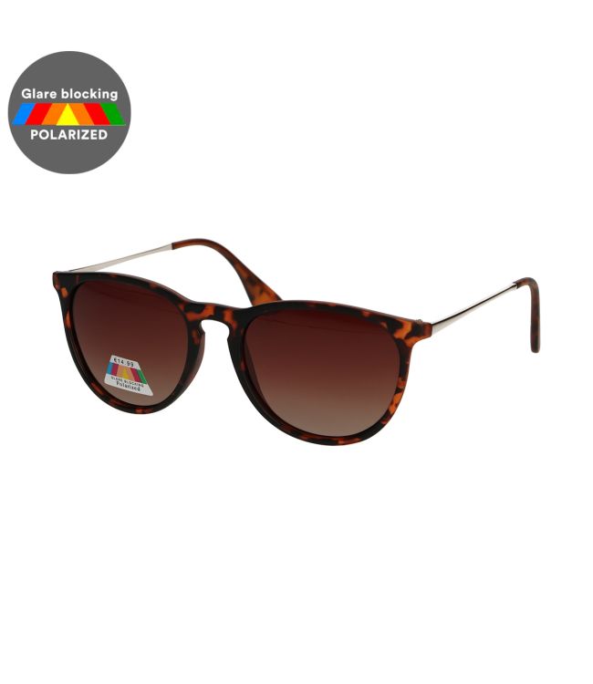 Spectrum Polarized Zonnebril Rond Tortoise Goud Bruin Dames is een bril met een UV400/ CE-CAT 3 filter. Deze zonnebril is nikkel vrij en ISO 12312-1. Dit is een stijlvol montuur voor dames die helpt om de ogen te beschermen tegen de zon. Deze bril heeft een rond model met een matte tortoise print in een gele/bruin tint met metaal gouden pootjes. Deze zonnebril is voorzien van bruine glazen die het kijken in de zon prettiger maken.
